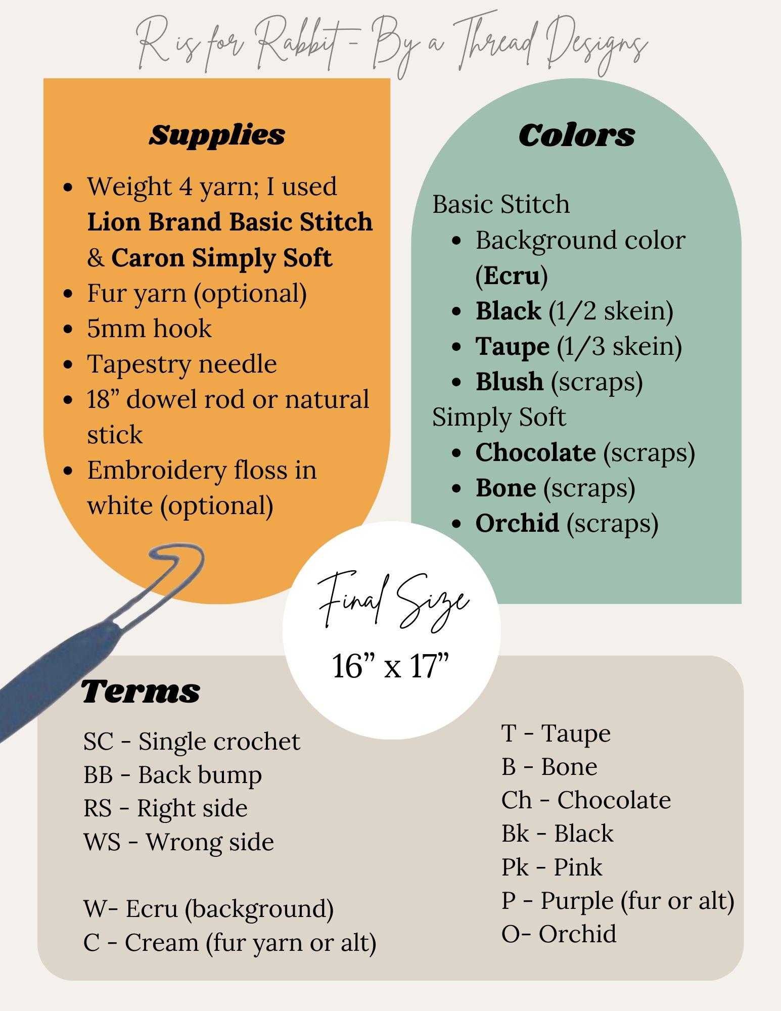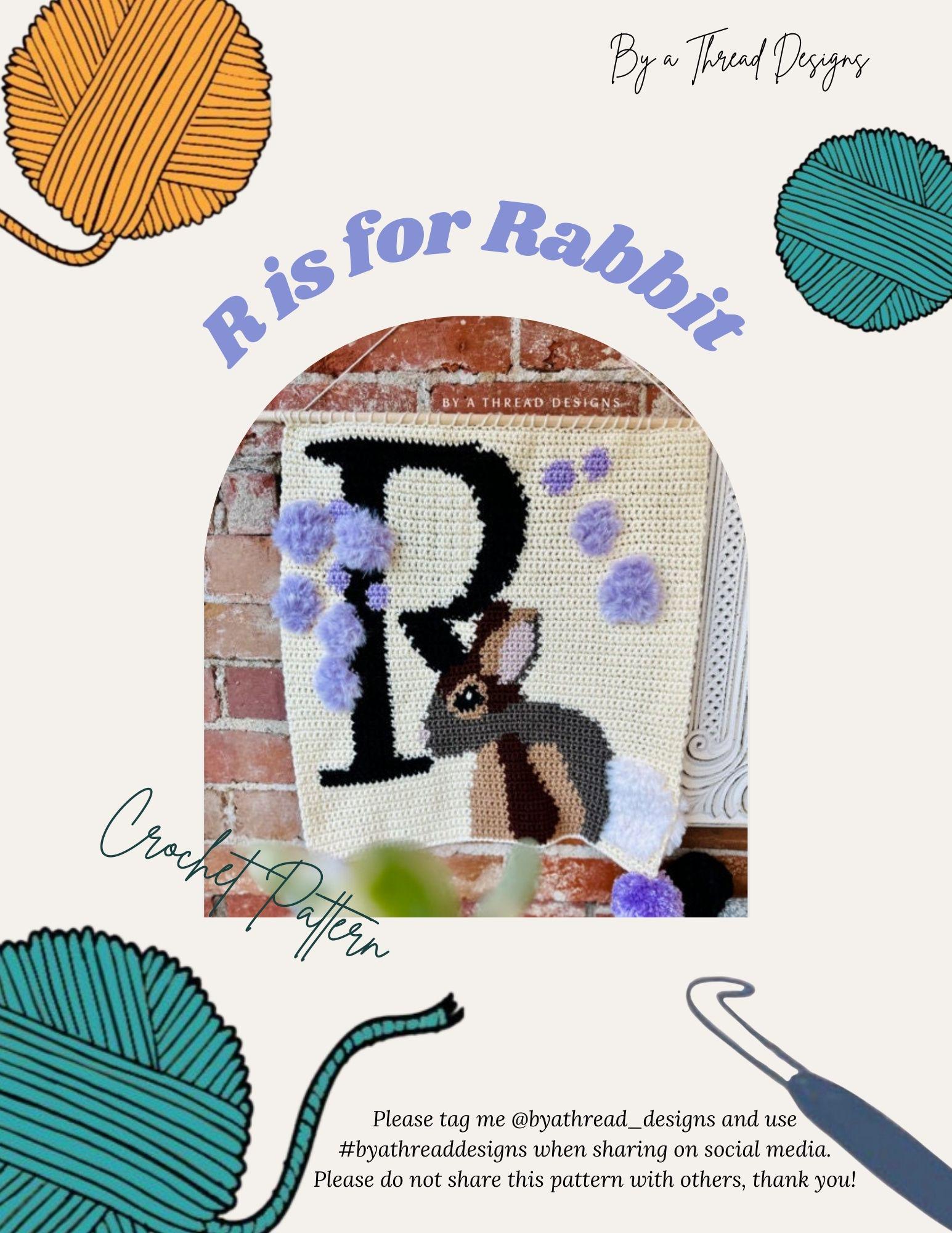 The R is for Rabbit crochet pattern is a digital PDF that walks you through creating a 16” x 17” wall tapestry featuring an adorable rabbit design and bold alphabet letter.