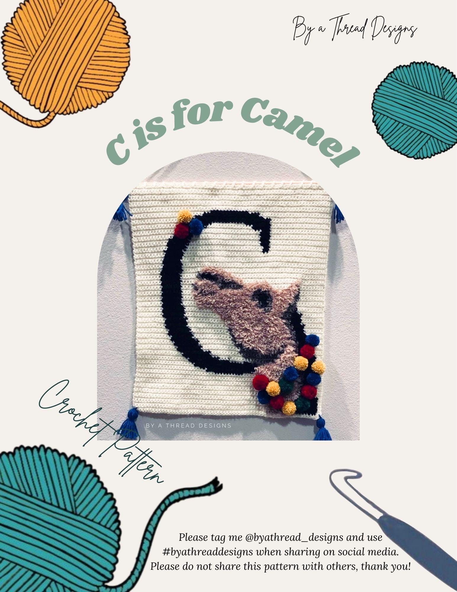 The C is for Camel crochet pattern is a digital PDF that guides you step-by-step through creating a 15” x 18” alphabet wall tapestry featuring an adorable camel design.